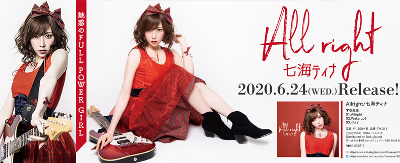 恵比寿マスカッツのメンバーでもある七海ティナが本格アーティストとしてシングル『Allright』でソロデビュー。アイドル時代から歌唱力に定評があった七海。今回は自ら歌詞を書き下ろしてロックなエモサウンドに挑戦。タワーレコード全店ではアナザージャケットが特典。