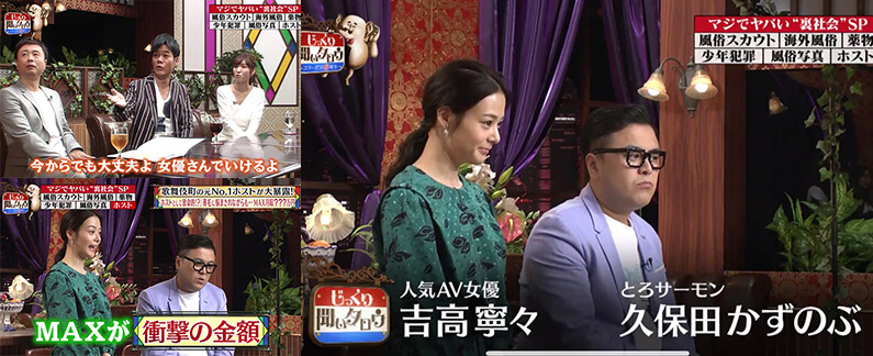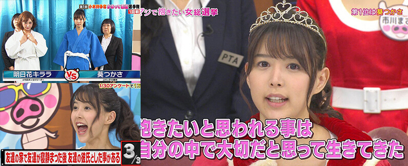 カリギュラの視聴はこちらAmazonプライムビデオ 『今田×東野のカリギュラ』 の「自作自演やらせドッキリ~今田耕司編~」にて、エイトマン所属モデル4人(葵つかさ、飛鳥りん、七海ティナ、陽向さえか)がドッキリの仕掛け人として出演。